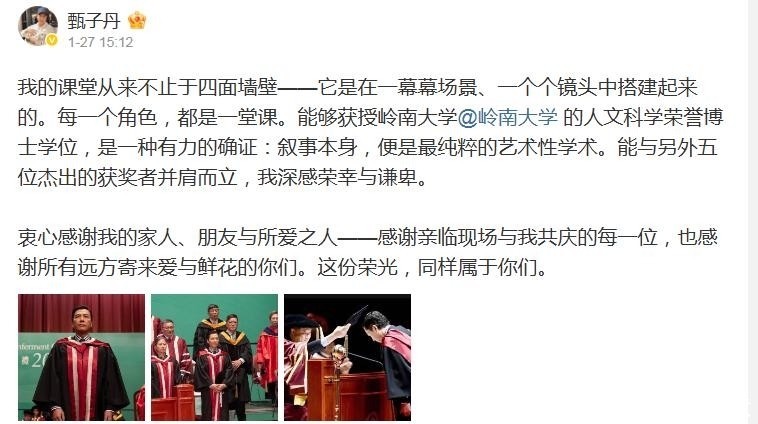 2024年,香港岭南大学授予甄子丹荣誉人文学博士学位,他是当年唯一获此殊荣的演艺界代表。