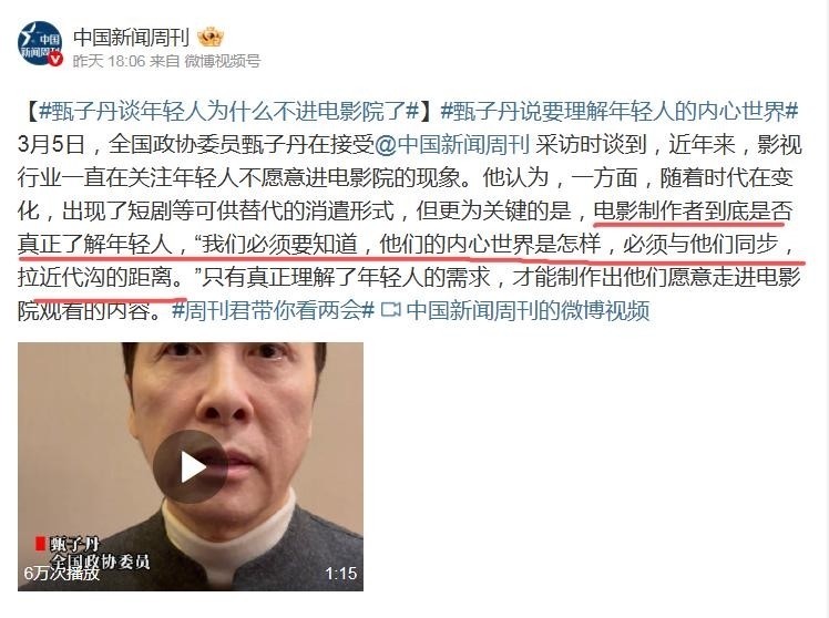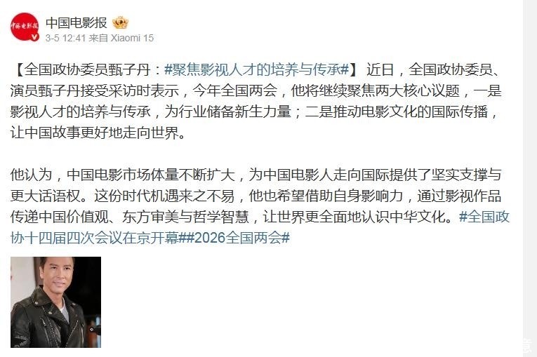此外,他在会议期间明确列出今年履职两大重点方向:一是构建系统化、阶梯式的影视后备人才培养机制;二是推动中国电影以更开放、更富创意的方式走向世界舞台。